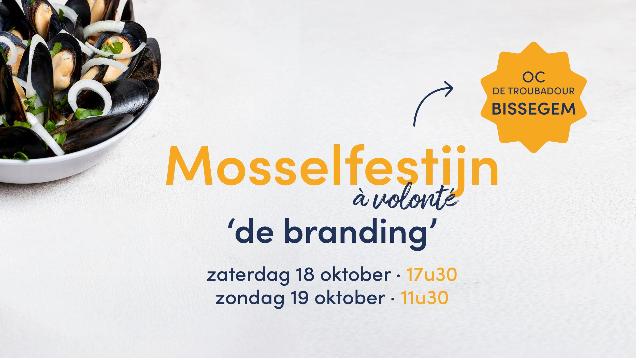 We nodigen jullie graag uit op het mosselfestijn van ‘de branding’ in OC De Troubadour in Bissegem. Iedereen is van harte welkom op zaterdag 18 oktober (17u30) of zondag 19 oktober (11u30)! Dit jaar kan je genieten van overheerlijke mosselss à volonté.